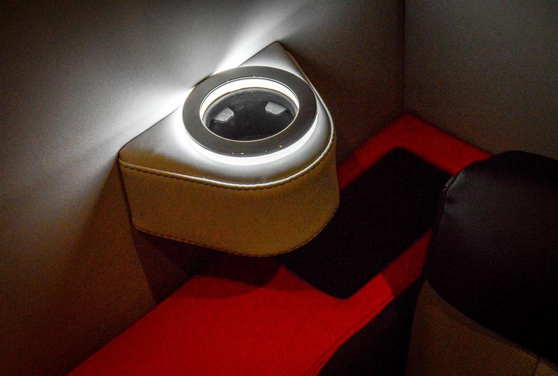 Throughout the interior are four LED illuminated cup holders as well as several ceiling and under cabinet LED lights. The soft grey vinyl padded walls harmonize well with the black and red accents of the interior. The red accent stripe found along the lower horizontal edge of the wall cabinets is a small, integrated padded and upholstered rail to provide a "soft edge". The base cabinet has a rounded corner as well as a rounded bull nose top to help reduce the amount of sharp edges in the unit. Attention to many details were taken in the design and fabrication of the interior design.